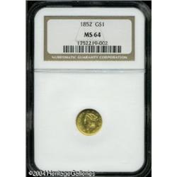 1852 G$1 MS64 NGC. Sharply struck and fully lustro <B>1852 G$1 MS64 NGC.</B></I> Sharply struck and fully lustrous, with bright golden-yellow color, and some superficial luster grazes and faint die striations (as struck) in the obverse fields. <BR><BR><B>Important notice:</B> Heritage usually auctions material at the rate of 200-250 lots per hour. On some occasions eBay Live bid software or the Internet may not be able to keep up with the pace of the auction. We recommend placing a realistic absentee bid now as insurance to avoid disappointment. Occasionally the auctioneer may eliminate or reject an eBay Live bid, and the auctioneer may also reopen a lot after the close of the eBay live bidding (usually because we missed an audience bid), and may reject your bid even if it shows you as the winning bidder. By bidding via eBay Live, you agree that Heritage may award the lot to another bidder at its sole discretion under the circumstances described above or any other reasonable circumstances. Since eBay bids are not shown to us until we open the lot on the floor, we treat those bids just like floor bids. In most cases the floor responds before the eBay bid is presented to us, due to Internet lag time, so for consistency we have made it a policy that floor bids are always considered first over tie eBay live bids. Also please note that all Heritage lots purchased through eBay Live carry a 20% Buyer's Premium. Please make sure you read the Terms and Conditions before you bid. This lot is being auctioned in conjunction with a live floor auction by Heritage Galleries & Auctioneers. All final auction and invoice information will be supplied by Heritage Galleries & Auctioneers, and all other information should be considered preliminary. Lot:6432