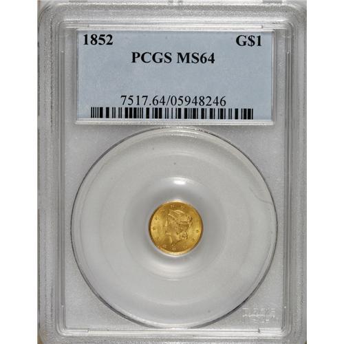 <B>1852 G$1 MS64 PCGS.</B></I> Boldly struck over the central details, except for the second L in DOLLAR, with some weakness and several spidery die cracks noted along the peripheries. Bright, full mint luster and unmarked surfaces generate a high level of eye appeal.<BR><BR><b>Shipping:</b> Coins & Currency (<a target="_blank" href="http://www.heritageauctions.com/common/shipping.php">view shipping information</a>)