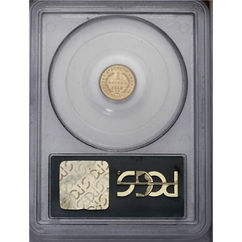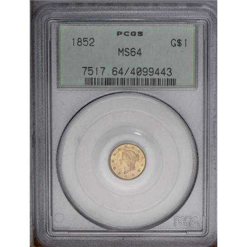 <B>1852<G$1> MS64 PCGS.</B></I> This meticulously struck and impressively lustrous near-Gem is housed a green label holder, and the peach and lime surfaces are only faintly abraded. The 2 in the date is heavy relative to the first three digits. <BR><BR><B>Important notice:</B> Heritage usually auctions material at the rate of 200-250 lots per hour. On some occasions eBay Live bid software or the Internet may not be able to keep up with the pace of the auction. We recommend placing a realistic absentee bid now as insurance to avoid disappointment. Occasionally the auctioneer may eliminate or reject an eBay Live bid, and the auctioneer may also reopen a lot after the close of the eBay live bidding (usually because we missed an audience bid), and may reject your bid even if it shows you as the winning bidder. By bidding via eBay Live, you agree that Heritage may award the lot to another bidder at its sole discretion under the circumstances described above or any other reasonable circumstances. Since eBay bids are not shown to us until we open the lot on the floor, we treat those bids just like floor bids. In most cases the floor responds before the eBay bid is presented to us, due to Internet lag time, so for consistency we have made it a policy that floor bids are always considered first over tie eBay live bids. Also please note that all Heritage lots purchased through eBay Live carry a 20% Buyer's Premium. Please make sure you read the Terms and Conditions before you bid. This lot is being auctioned in conjunction with a live floor auction by Heritage Galleries & Auctioneers. All final auction and invoice information will be supplied by Heritage Galleries & Auctioneers, and all other information should be considered preliminary. Lot:2262 <BR><BR><B>Winning Notification and Billing:</B> After the FINAL session in this auction is complete, Heritage will send e-mail and snail mail invoices. This process normally takes several days. All final auction and invoice information will be supplied by Heritage Galleries & Auctioneers, and all other information should be considered preliminary. <BR><BR>This auction will be conducted on a live auction floor and over the Internet through eBay Live. If you choose to place an absentee bid, please take a moment to <font color='#0000ff'><u><a href='http://pages.ebay.com/liveauctions/help/before/laabsentee.html'>learn how eBay Live absentee bidding works</a></u></font><font color='#000000'>
