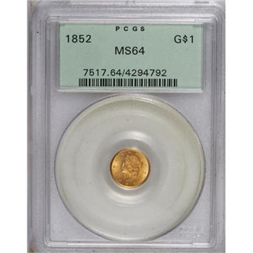 <B>1852 G$1 MS64 PCGS.</B></I> This beautiful and mark-free near-Gem features prominent luster and peach toning. Boldly struck save for the A in DOLLAR and the right-side reverse denticles. Encapsulated in a green label holder.<BR><BR><B>Coin Engraver:</B> James B. Longacre<BR><BR><b>Shipping:</b> Coins & Currency (<a target="_blank" href="http://www.heritageauctions.com/common/shipping.php">view shipping information</a>)