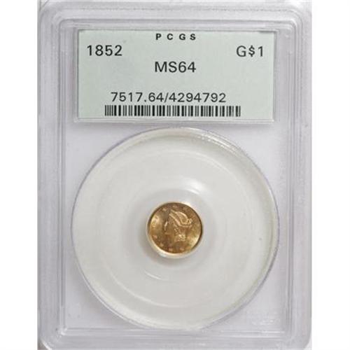 <B>1852 G$1 MS64 PCGS.</B></I> This beautiful and mark-free near-Gem features prominent luster and peach toning. Boldly struck save for the A in DOLLAR and the right-side reverse denticles. Encapsulated in a green label holder.<BR><BR><B>Coin Engraver:</B> James B. Longacre<BR><BR><b>Shipping:</b> Coins & Currency (<a target="_blank" href="http://www.heritageauctions.com/common/shipping.php">view shipping information</a>)
