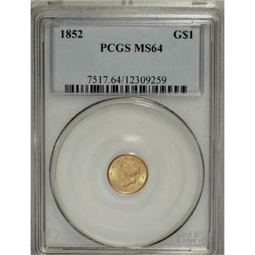 <B>1852 G$1 MS64 PCGS.</B></I> Exceptional mint frost illuminates the mint-green and yellow-gold surfaces. Very well struck for the issue and with no apparent clash marks. Unabraded and pleasingly clean on both sides. <BR><BR><B>Coin Engraver:</B> James B. Longacre<BR><BR><b>Shipping:</b> Coins & Currency (<a target="_blank" href="http://www.heritageauctions.com/common/shipping.php">view shipping information</a>)