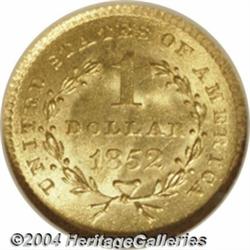 <table><tr><td><table><tr><td>1852 G$1 MS66 NGC. This shimmering little beauty has a needle sharp strike, frosty luster that is more reminiscent of larger gold coins that that typically seen on gold dollars, and is blemish-free even when viewed under a glass. While common in lower grades, this issue is very scarce at the Gem level and is rare any finer. Population: 11 in 66, 9 finer (4/04). <BR><BR><B>Important notice:</B> Heritage usually auctions material at the rate of 200-250 lots per hour. On some occasions eBay Live bid software or the Internet may not be able to keep up with the pace of the auction. We recommend placing a realistic absentee bid now as insurance to avoid disappointment. Occasionally the auctioneer may eliminate or reject an eBay Live bid, and the auctioneer may also reopen a lot after the close of the eBay live bidding (usually because we missed an audience bid), and may reject your bid even if it shows you as the winning bidder. By bidding via eBay Live, you agree that Heritage may award the lot to another bidder at its sole discretion under the circumstances described above or any other reasonable circumstances. Since eBay bids are not shown to us until we open the lot on the floor, we treat those bids just like floor bids. In most cases the floor responds before the eBay bid is presented to us, due to Internet lag time, so for consistency we have made it a policy that floor bids are always considered first over tie eBay live bids. Also please note that all Heritage lots purchased through eBay Live carry a 20% Buyer's Premium. Please make sure you read the Terms and Conditions before you bid. <BR><BR><B>IMPORTANT ANNOUNCEMENT ABOUT RESERVES:</B> Heritage now divulges all reserves on its web site 7 days before every auction. If you want to know whether the reserve on this lot has been met, and if not, what the reserve amount is, please visit this lot page on the HeritageCoin.com web site, or email: bid@HeritageGalleries.com </span></font></td></tr></table></td></tr></table>