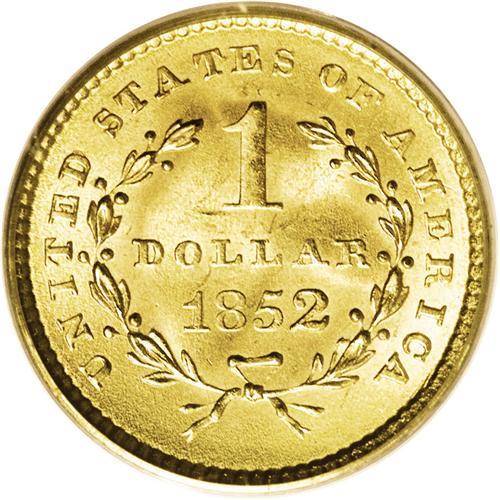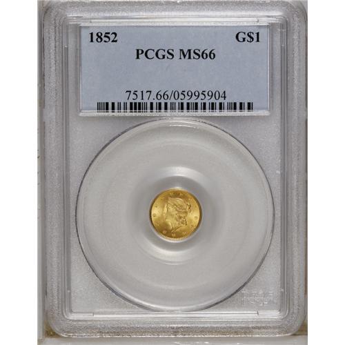 <B>1852 G$1 MS66 PCGS.</B></I> This is an amazing Premium Gem with fully detailed obverse and reverse designs in addition to frosty light yellow luster and full brilliance. A high-quality example with just a handful of finer pieces certified. Population: 11 in 66, 5 finer (10/06).<BR><BR><b>Shipping:</b> Coin/Currency (<a target="_blank" href="http://www.heritageauctions.com/common/shipping.php">view shipping information</a>)