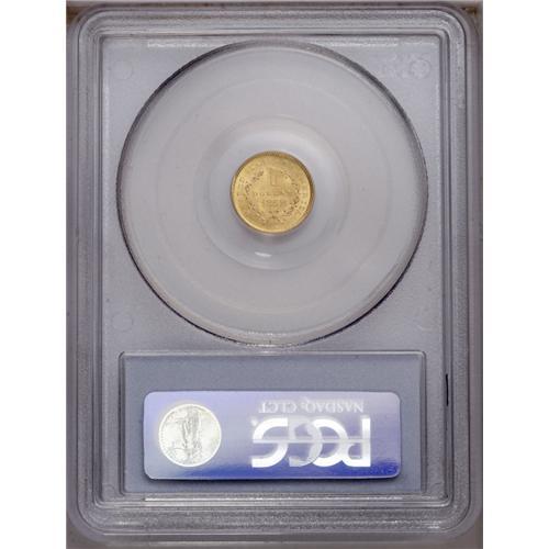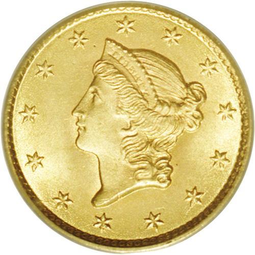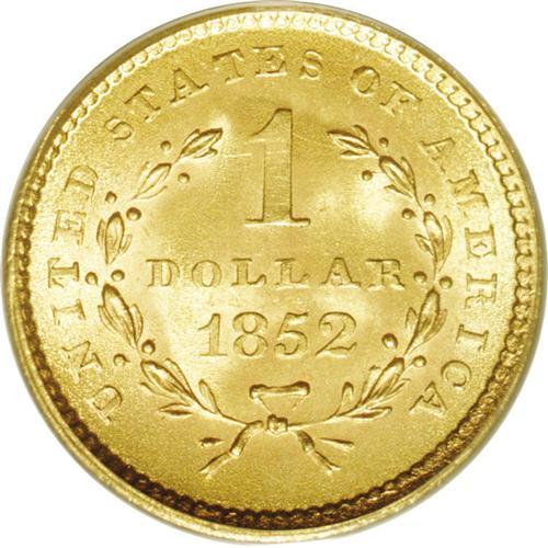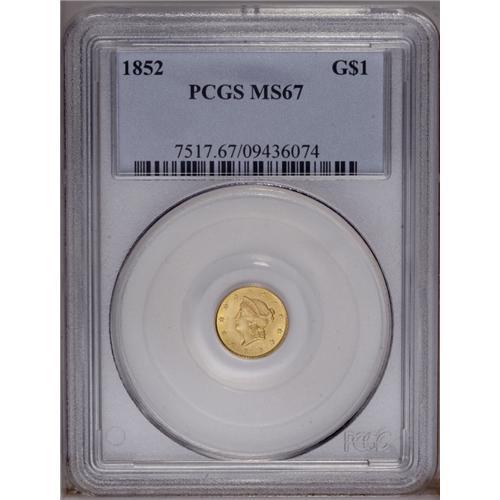 <B>1852<G$1> MS67 PCGS.</B></I> This Superb Gem coin approaches perfection, both from technical and aesthetic standpoints. It is difficult to say which is superior, the surfaces or the strike. The color alternates from a predominant honey-gold on the obverse to areas of greenish-gold and copper-gold on both sides. The frosty luster is full and unbroken, even as it passes through toned areas of varying intensity. The strike on both sides is so superb that it brings out details seldom seen: not only are the star centrils all full as expected, but also each individual point atop Liberty's coronet is prominent. Each lock of hair is full and sculpted--to the point that individual hair strands are quite apparent--and shows absolutely no weakness anywhere. The small reverse wreath shows all detail that was impressed into the die. No central weakness is seen, either on the date or denomination. There are old, light signs of die clashing on the reverse, and on the obverse a small die crack runs from star 1, just above the bust truncation, to the rim nearby. A minute dark spot between star 5 and the coronet is barely noticeable, even under a high-powered loupe. This coin is nearly unimprovable, since PCGS has graded only four examples higher, with one finer at NGC (1/06).