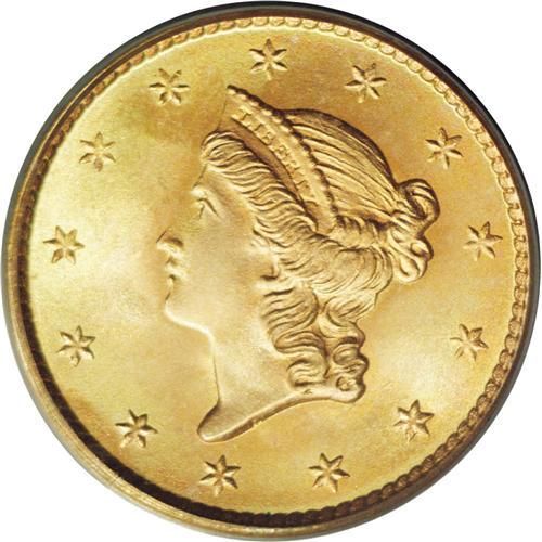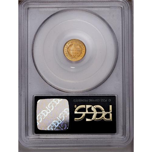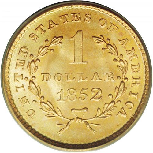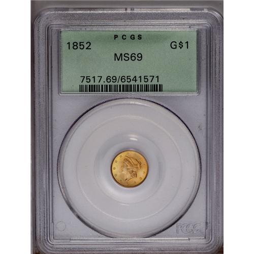 <B>1852 G$1 MS69 PCGS.</B></I> When Alexander Hamilton created the original text that became the Mint Act of 1792, he recommended a bi-metallic standard including both gold and silver. The unit of this coinage system was the dollar, which he envisioned would be struck in both metals. Hamilton specifically recommended a gold piece of 10 dollars, another of one dollar, a silver piece of one dollar, a silver dime or disme, a copper cent, and a copper half cent. As we know, Congress did not actually include the gold dollar in the Mint Act of 1792, and it would be nearly 60 years before the gold dollar actually became a reality. Gold dollars and double eagles were authorized by Congress in 1849, partly to provide additional uses for all of the California gold that began to make its way to world markets.<BR> This example is instructive for Mint workmanship. When coinage dies were made at the Mint, various combinations of individual digits or multiple digit punches were used to enter the date in the die. In the case of this particular issue, the digits 185 were clearly punched as a single unit, with the final digit added later. This can be determined by visual observation. Note that the digits 185 have less depth (in the die, raised on the coin) than the digit 2, which is clearly larger and heavier.<BR> The gold dollar offered in the present lot is an amazing specimen. It appears to be from new dies with no evidence of lapping or other defects. In a word, this coin is Superb. Both sides have amazing definition of the design, showing every individual element exactly as it was intended by James Longacre. Frosty surfaces have rich orange-gold luster without blemishes of any kind, save for a single minute mark below the digit 5. It is this tiny blemish that prevented an MS70 grade. Without a doubt, this coin in its older green-label PCGS holder represents the ultimate quality Type One gold dollar. Population: 1 in 69, 0 finer (1/06).