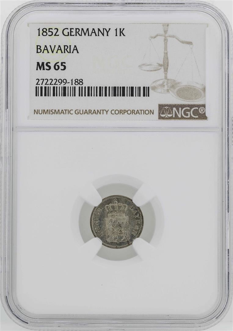 One 1852 Germany Bavaria Kreuzer Coin NGC MS65. NGC Certified.