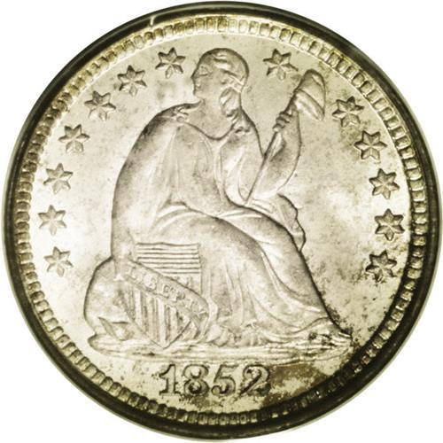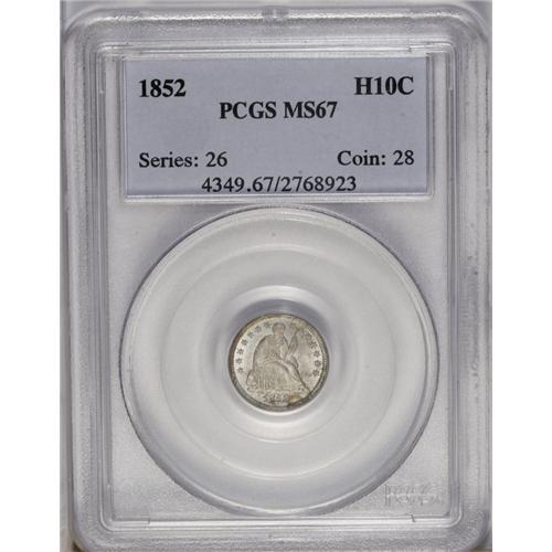 <B>1852<H10C> MS67 PCGS.</B></I> Pastel tan-gold and aquamarine shades enrich this shimmering and well struck Superb Gem. Extensive scrutiny beneath a loupe fails to reveal any abrasions, although overlapping sets of clashmarks are noted near the centers. The 1852 is scarce and underappreciated in Mint State. Superb Gems reside within the Condition Census. Population: 4 in 67, 1 finer (7/06).