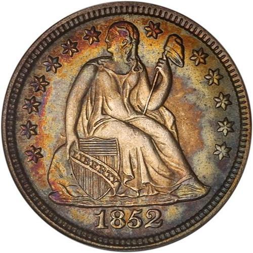 <b>1852 Liberty Seated Dime. PCGS graded MS63.</b> Peripheral toning. Attractively toned over choice mint luster <b>(PCGS # 4597)</b> <i>