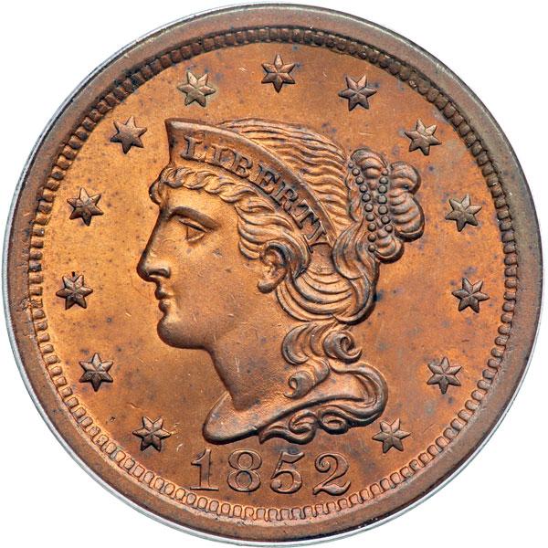 1852 N-10 R2. PCGS graded MS-65 Red & Brown. Lustrous faded mint red changing to steel brown on the highpoints, about 70% of the mellowed red remaining, mostly on the obverse. Tiny specks of dark toning are sprinkled over both sides, including one in the field touching the main curl. A tiny planchet flake high on the cheek under the right edge of the eye is a good identifying mark. This cent offers nice eye appeal, but the luster is not as dominant as you expect for a piece with this much faded mint color. Rare EDS, die state a, with diagonal die lines from the dentils at star 2. Called MS63 and tied for CC#1 in the Noyes census, his photo #30657. Our grade is MS63, tied for CC#1 in the Grellman census. PCGS population 1; none finer in Red & Brown at PCGS for the variety. DWH #3583 (PCGS # 147255) .