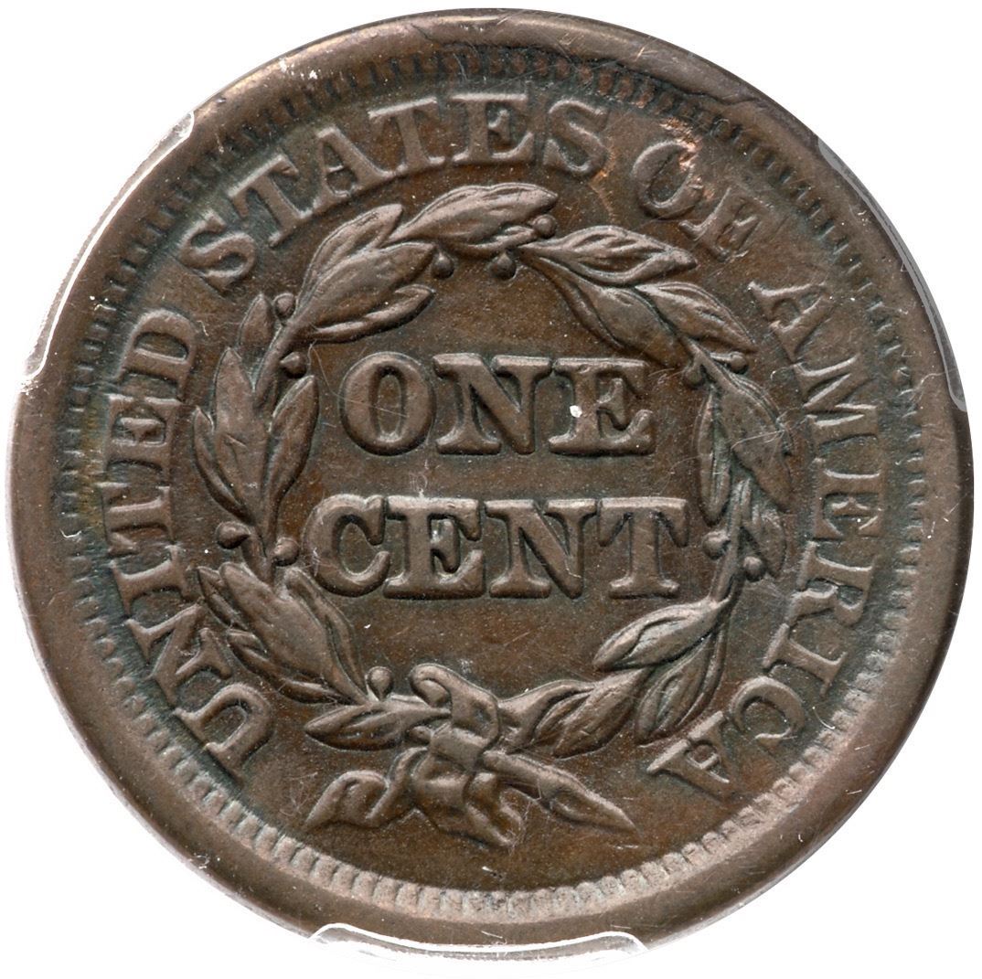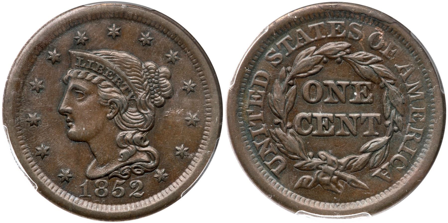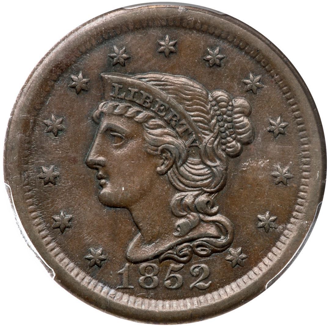 1852 N-11 R-1 PCGS AU Details (Altered Surfaces)AU sharpness but recolored and now pleasing chocolate brown and olive browns. The only marks are a couple nicks at S O in STATES OF that reveal the red underneath. Smooth, glossy surfaces. Strong reverse rim break at TES O. Our grade is XF40.Certificate Number: Pedigree: Ex; Henry Hettger