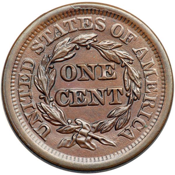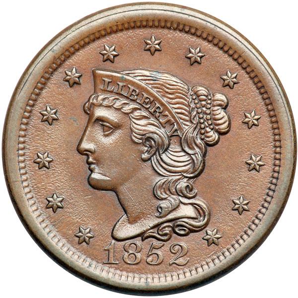 1852 N-11 R1 AU55. Glossy medium brown and chocolate, possibly retoned but the eye appeal is very nice for the grade. The only mark is a nick-like planchet chip on the chin, as struck. M-LDS, die state d late. There is a strong die crack on the rim over TES-O outlining where the cud break is about to occur. The crack is stronger on this example than on any other seen. Plated to illustrate the die state in the 2001 edition of the Grellman book on the series. DWH #2191.