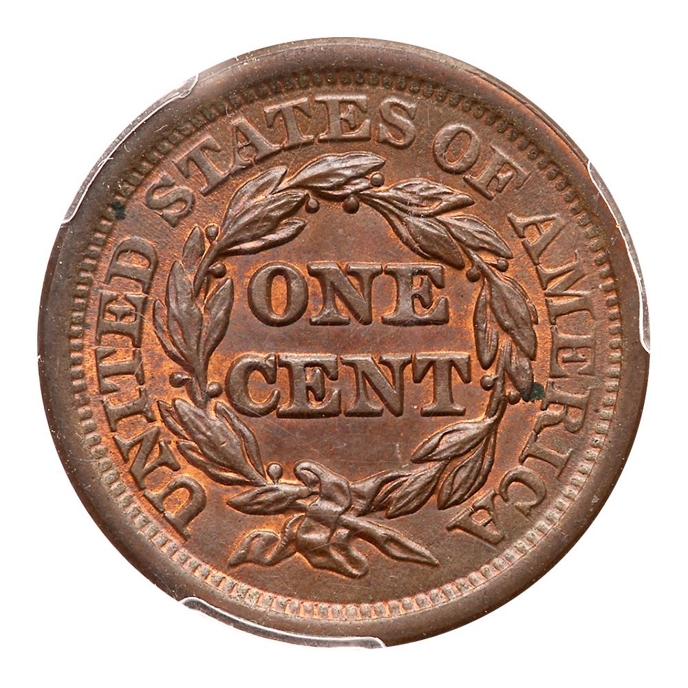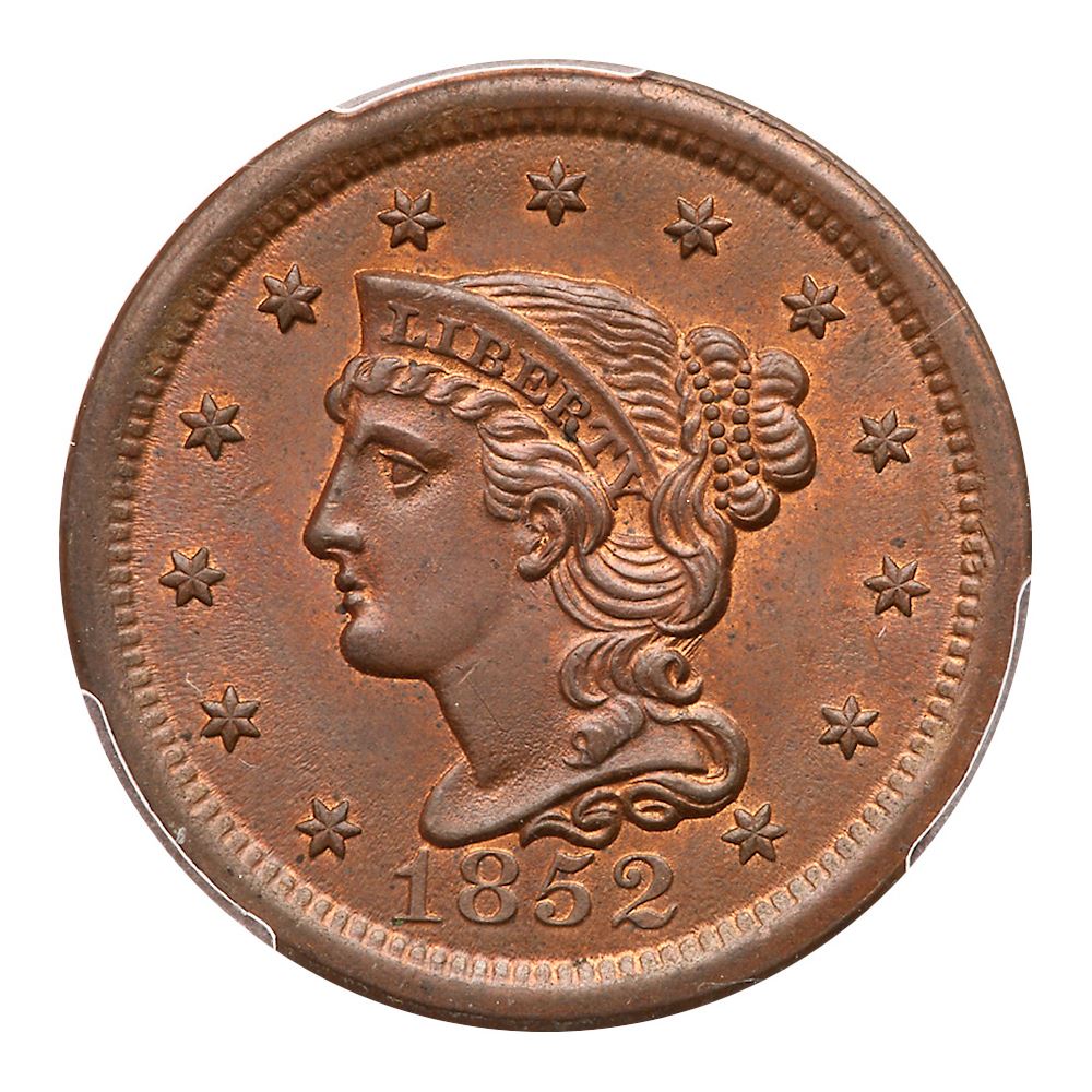 1852 N-11 R1 PCGS graded MS64 Brown. Frosty light olive and steel brown with about 15% of the planchet showing mint color. The surfaces are satiny and the eye appeal of this cent is quite nice. The only marks are a spot of carbon nestled into the dentils right of the D in UNITED and another under the R in AMERICA. M-LDS, die state d. Our grade is MS62+. Estimated Value 325 - UP