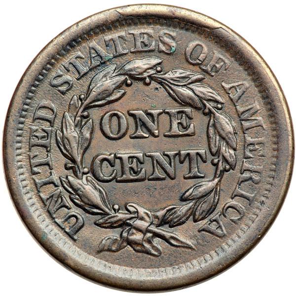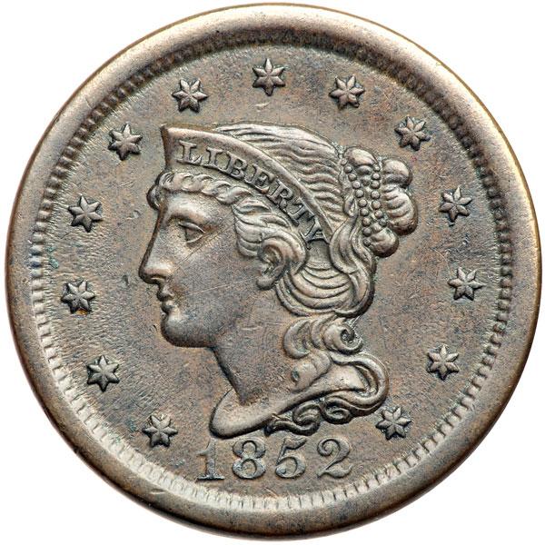 1852 N-11 R1 VF30. Sharper by at least 10 points with several fine hairline scratches from the cheek into the field over star 2, plus a pinprick in the field close off the tip of the nose. Glossy dark steel brown and chocolate. TDS, die state e, with a strong rim cud break over TES-O. Tied for CC#5 of those known with the cud. DWH #1211.