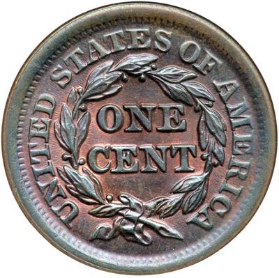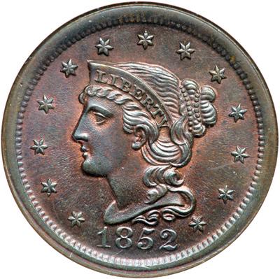 1852 N-15 R3. NGC graded MS-65 Brown. Lustrous dark bluish steel and olive brown with faded mint red covering about 15% of both sides. Great eye appeal and only a few trivial marks, including a tiny nick on the rim near the dentils under the 5 and a microscopic pinprick on the rim just above star 4. LDS, die state c. The die lines and points at NE in ONE are gone and the obverse fields are covered with radial die flowlines that create great cartwheel luster. Our grade is MS63, tied for CC#3 in the Grellman census. The NGC label includes the attribution.