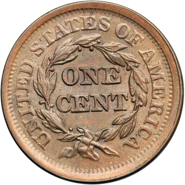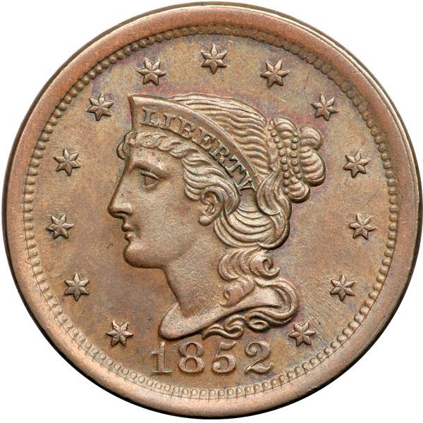1852 N-16 R1 AU55. Frosty light steel brown with hints of faded mint color in a few protected areas. A tiny planchet flake in the field close off the chin is the only mark. LDS, die state b late. The die line inside the E in ONE is long gone and the dies are flowlined. DWH #1221.