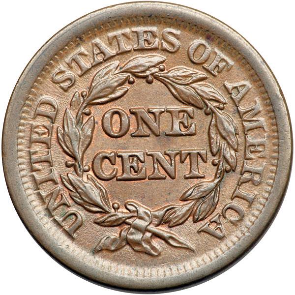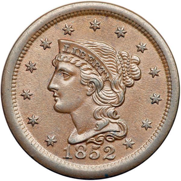 1852 N-21 R4 AU58+. Very close to mint state with just the barest hint of rub on the highest points of the design. Lustrous light steel brown with peeps of faded mint color remaining on both sides. No spots and only a couple microscopic marks, including a very tiny rim nick at star 1 and another over the left side of the M in AMERICA. LDS, die state c. The dies are flowlined, the die crack from the coronet through star 5 is clear, and the die clashmarks show in the center of the reverse. Very attractive with solid mint state eye appeal. CC#6 in the Grellman census. Removed from an NGC slab graded MS64BN (NGC label included, and it shows the attribution and Reiver provenance). DWH #3008.