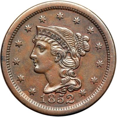 1852 N-21 R4. VF-35 Plus. Very attractive glossy chocolate and light olive brown. Smooth and virtually flawless. A small spot of lighter brown toning over the E in STATES offers the best identifying mark. MDS, die state b. A fine die crack extends from the coronet tip through star 5 to the dentils over star 4.