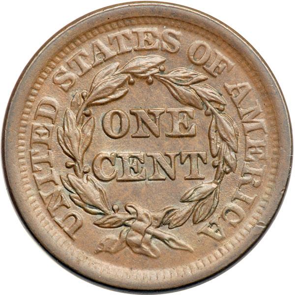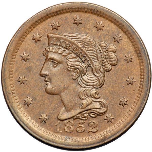 1852 N-23 R6- AU55. Frosty medium brown. There is a spot of light carbon in the field under star 4 and a small nick on the rim at C in AMERICA. E-MDS, die state a. The obverse fields are covered with fine die flowlines but there are no rim cud breaks on the reverse. CC#5 in the Grellman census. Removed from an NGC slab graded MS64BN (NGC label included). DWH #2334.