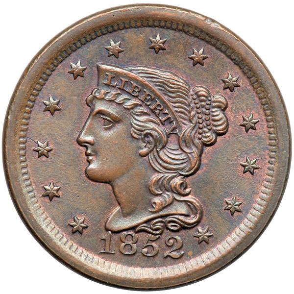 1852 N-3 R1 MS62. Lustrous light bluish steel brown and olive with traces of original mint color on both sides, mostly on the obverse. No marks or stains. The best identifying mark is a small struck-through line left of star 3. LDS, die state c. The base of the 1 in the date is very thin due to die wear and lapping and the reverse is rotated 45 degrees CCW. Excellent eye appeal for the grade, close to choice.