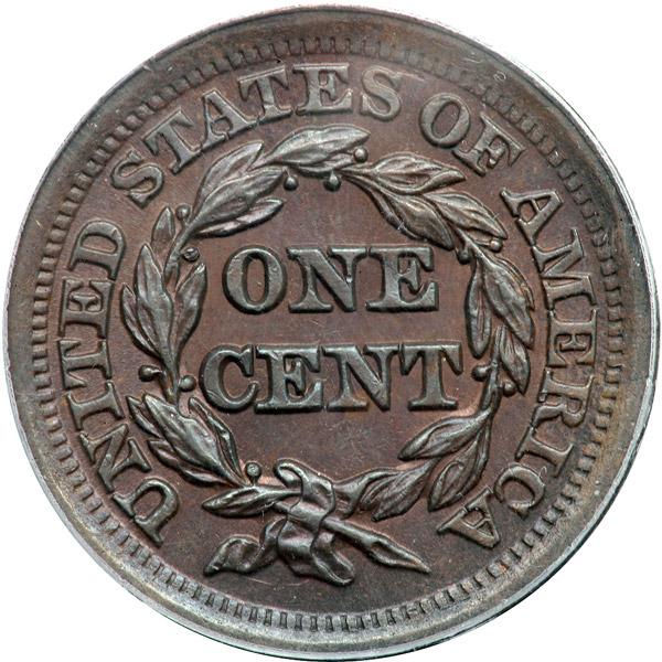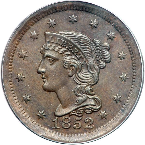 1852 N-4 R1 PCGS graded MS63 Brown. Olive and chocolate brown with hints of underlying very faded mint color showing through on the reverse. No defects, but the luster is a bit subdued and there is a very light touch of rub on the highest points. E-MDS, die state a. The reverse remains uncracked. Our grade is AU58+, very close to mint state. The attribution is noted on the PCGS label. Pop 1; 4 finer; 2 in 64BN;1 in 65BN; 1 in 66BN.