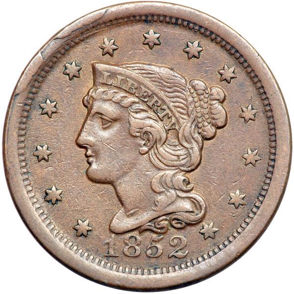 1852 N-5 R2 VF30. Attractive glossy medium brown. Smooth and free of any notable defects. Extremely rare terminal die state, die state d, with two clearly defined rim cud breaks on the obverse, one from star 4 to star 5 and another from star 5 to star 6. Third finest of only 7 examples known with the 2 rim cuds. DWH# 3468.