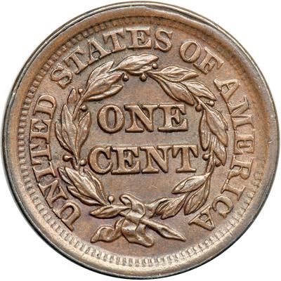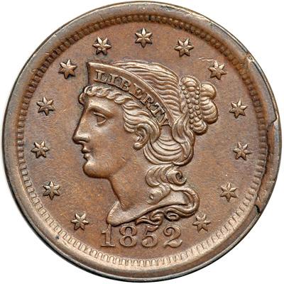 1852 N-6 R2. AU-50 Plus. Obverse Rim Cud. Lustrous light chocolate and steel brown. Satiny mint luster covers the fields and this cent offers excellent eye appeal. Close to AU55 but there is a shallow planchet void on the rim right of star 9 and a less obvious one on the rim over star 8 (both as struck). LDS, die state c, with a large, strong rim cud break on the right side of the obverse. A nice example of this popular and impressive die state.