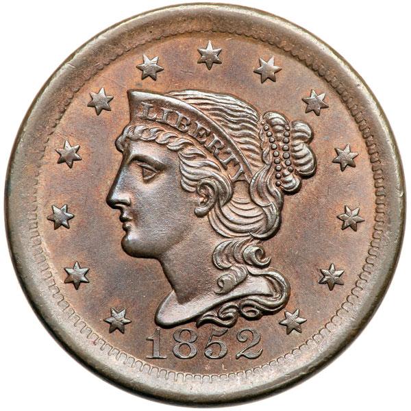 1852 N-8 R2 MS63. Lustrous steel brown, the obverse a couple shades darker than the reverse, with 10% of the mint red remaining, mostly on the reverse. Satiny and very attractive, virtually flawless. The best identifying mark is a tiny spot of darker toning close over the tip of the coronet. LDS, die state d. The two fine die cracks on the obverse are present and a final die crack extends from the dentils through the D in UNITED to the wreath below. DWH #1207.