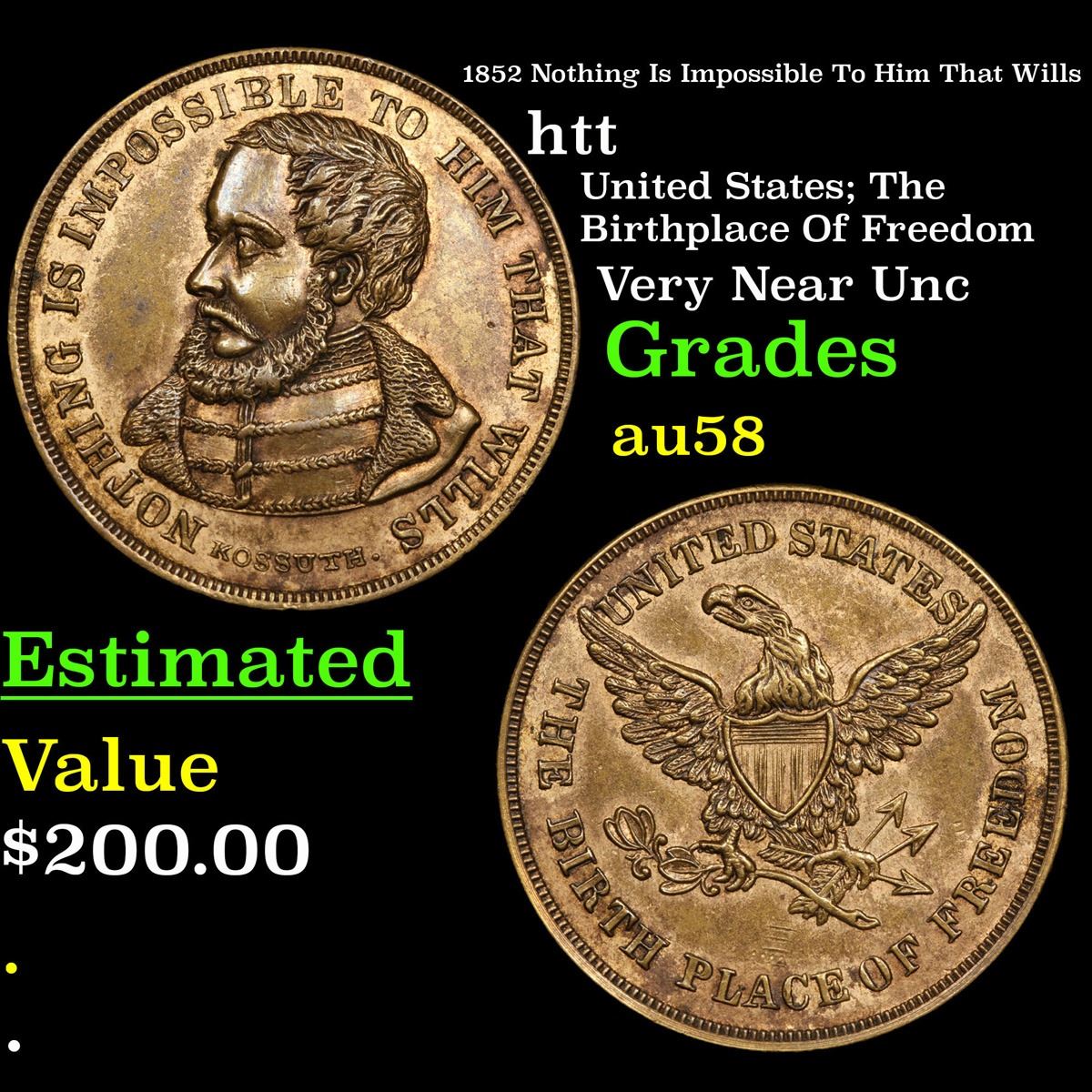 1852 Nothing Is Impossible To Him That Wills Kossuth Token Grades Choice AU/BU Slider. Up for Auction is a Louis Kossuth, the Washington of Hungary Token, Gilt Covered. 1852 Kossuth of Hungary Gaming Counter Token. These tokens were made to pass as a US $10 Gold coin. The change was given to support the revolt of 1852.These coins are very rare anda great part of Hungarian History.
