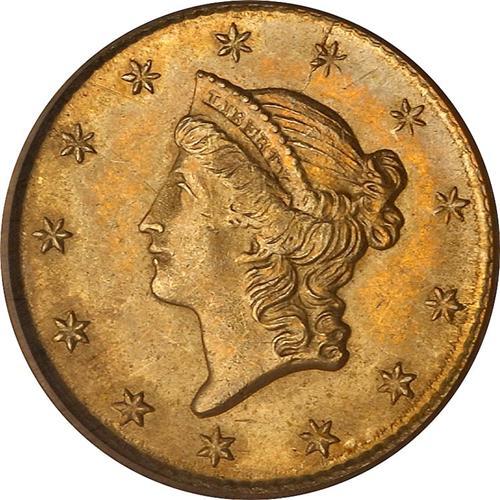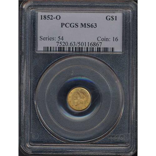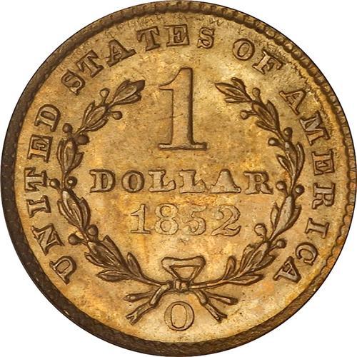 Mintage for this date 140,000.All with the Large O Mint Mark. A well executed example of the date, virtually free of impairments. The third rarest New Orleans gold dollar. Bid is $4900 and trends $7500.