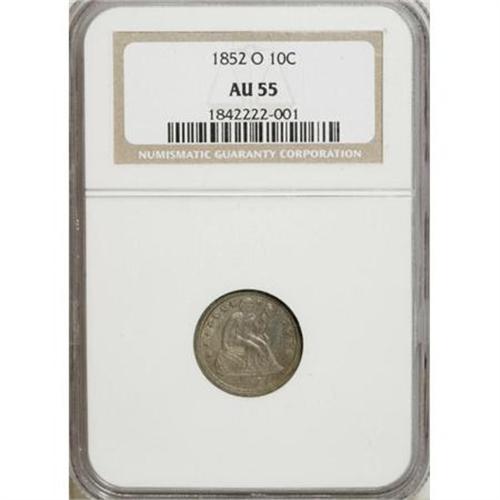 <B>1852-O 10C AU55 NGC.</B></I> Just a touch of wear affects the highpoints of this richly toned and luminous antebellum dime. Varying degrees of slate-blue, plum, and silver-gray patina drape the fields, and subtle golden-tan accents visit the margins. Census: 4 in 55, 32 finer (10/07).<BR><BR><B>Coin Engraver:</B> Christian Gobrecht<BR><BR><b>Shipping:</b> Coins & Currency (<a target="_blank" href="http://www.heritageauctions.com/common/shipping.php">view shipping information</a>)