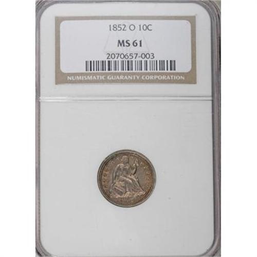 <B>1852-O 10C MS61 NGC.</B></I> Decisively struck for the issue with soft, subtle luster and faint marks scattered on each side. Peach, mustard-gold, and silver-gray toning graces each side of this antebellum New Orleans dime, an attractive and enticing survivor from an issue of just 430,000 pieces. Census: 4 in 61, 21 finer (11/07).<BR><BR><B>Coin Engraver:</B> Christian Gobrecht<BR><BR><b>Shipping:</b> Coins & Currency (<a target="_blank" href="http://www.heritageauctions.com/common/shipping.php">view shipping information</a>)