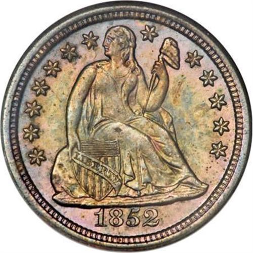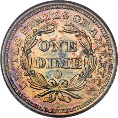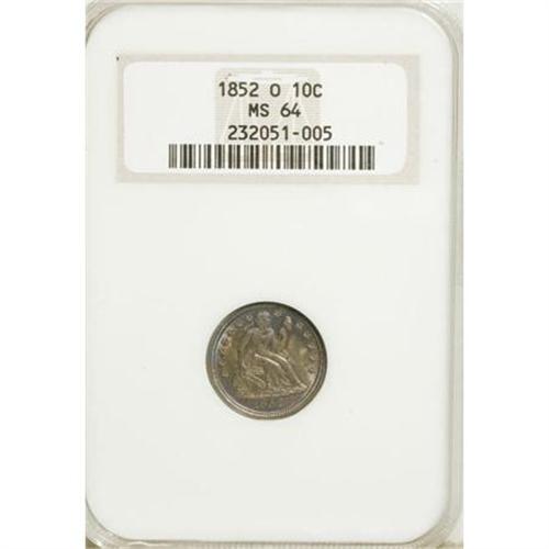 <B>1852-O 10C MS64 NGC.</B></I> While not heavily melted like the Philadelphia issues, New Orleans dimes were heavily circulated and very few were set aside in high grades. This is one of only 12 pieces so graded by NGC and PCGS combined with only three finer (all NGC). The fields show unusually bright mint luster for a New Orleans issue. Variegated blue and rose toning is scattered over each side. The strike is surprisingly sharp. A well-balanced coin from side to side.<BR><BR><B>Coin Engraver:</B> Christian Gobrecht<BR><BR><b>Shipping:</b> Coins & Currency (<a target="_blank" href="http://www.heritageauctions.com/common/shipping.php">view shipping information</a>)