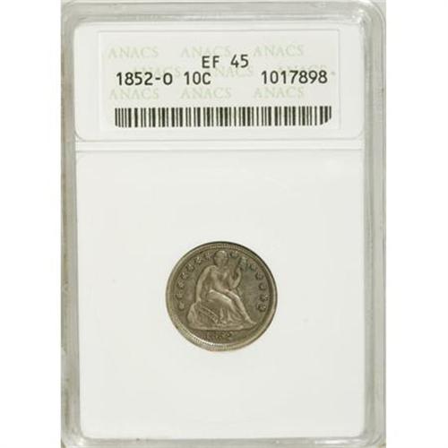 <B>1852-O 10C XF45 ANACS.</B></I> NGC Census: (1/37). PCGS Population (3/18). Mintage: 430,000. Numismedia Wsl. Price for NGC/PCGS coin in XF45: $301. (#4598)<BR><BR><B>Coin Engraver:</B> Christian Gobrecht<BR><BR><b>Shipping:</b> Coins & Currency (<a target="_blank" href="http://www.heritageauctions.com/common/shipping.php">view shipping information</a>)