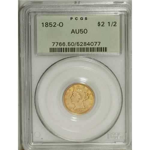 <B>1852-O<$2 1/2> AU50 PCGS.</B></I> Breen-6219. The "Extra Heavy O" variety, which was apparently punched unusually deep into the die, or was perhaps engraved by hand onto the working reverse die at New Orleans. This scarce New Orleans quarter eagle has bright orange toning and a few wispy field grazes. The lower half of the eagle and the curl beneath the ear are typically brought up. Housed in a green label holder. Population: 21 in 50, 50 finer (8/06).