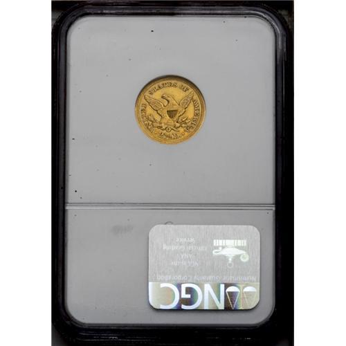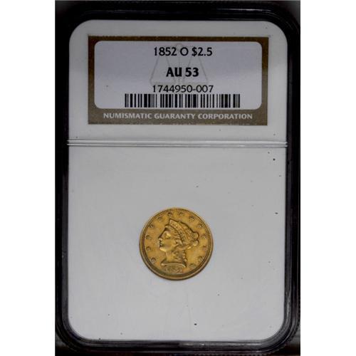 <B>1852-O<$2 1/2> AU53 NGC.</B></I> Variegated orange and yellow-gold patination is accented with whispers of lavender and sky-blue. The design elements are well defined, save for softness in the bottom portions of the eagle. A few minute contact and slide marks scattered about do not distract. The '52-O is more difficult than its 140,000 piece mintage would suggest.<BR><I>From The Steve Glenn Collection.</B></I> <BR><BR><B>Important notice:</B> Heritage usually auctions material at the rate of 200-250 lots per hour. On some occasions eBay Live bid software or the Internet may not be able to keep up with the pace of the auction. We recommend placing a realistic absentee bid now as insurance to avoid disappointment. Occasionally the auctioneer may eliminate or reject an eBay Live bid, and the auctioneer may also reopen a lot after the close of the eBay live bidding (usually because we missed an audience bid), and may reject your bid even if it shows you as the winning bidder. By bidding via eBay Live, you agree that Heritage may award the lot to another bidder at its sole discretion under the circumstances described above or any other reasonable circumstances. Since eBay bids are not shown to us until we open the lot on the floor, we treat those bids just like floor bids. In most cases the floor responds before the eBay bid is presented to us, due to Internet lag time, so for consistency we have made it a policy that floor bids are always considered first over tie eBay live bids. Also please note that all Heritage lots purchased through eBay Live carry a 20% Buyer's Premium. Please make sure you read the Terms and Conditions before you bid. This lot is being auctioned in conjunction with a live floor auction by Heritage Galleries & Auctioneers. All final auction and invoice information will be supplied by Heritage Galleries & Auctioneers, and all other information should be considered preliminary. Lot:2389 <BR><BR><B>Winning Notification and Billing:</B> After the FINAL session in this auction is complete, Heritage will send e-mail and snail mail invoices. This process normally takes several days. All final auction and invoice information will be supplied by Heritage Galleries & Auctioneers, and all other information should be considered preliminary. <BR><BR>This auction will be conducted on a live auction floor and over the Internet through eBay Live. If you choose to place an absentee bid, please take a moment to <font color='#0000ff'><u><a href='http://pages.ebay.com/liveauctions/help/before/laabsentee.html'>learn how eBay Live absentee bidding works</a></u></font><font color='#000000'>