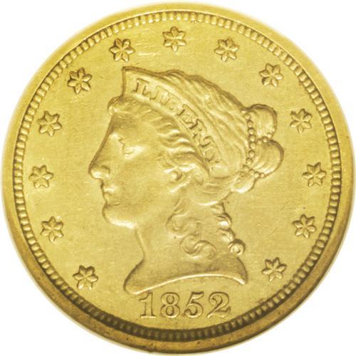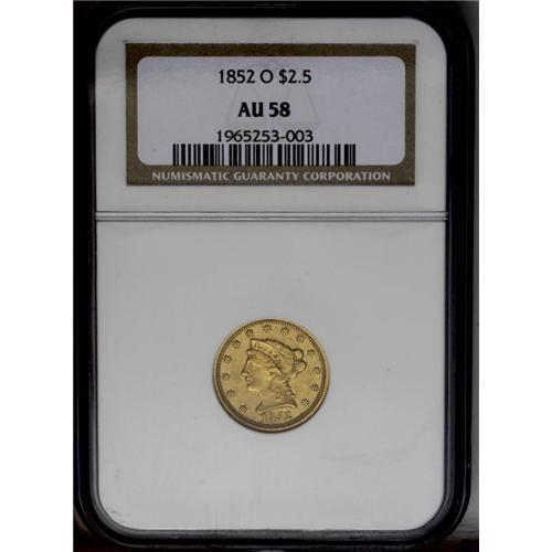 <B>1852-O<$2 1/2> AU58 NGC.</B></I> A moderately scarce issue, this piece is typical with softly impressed central details. Relatively clean for the grade with pronounced, muted green-gold color overall. Conditionally elusive in AU, rare in Mint State.