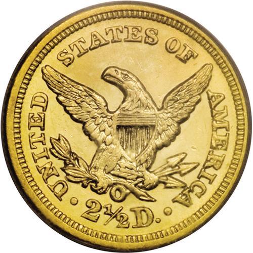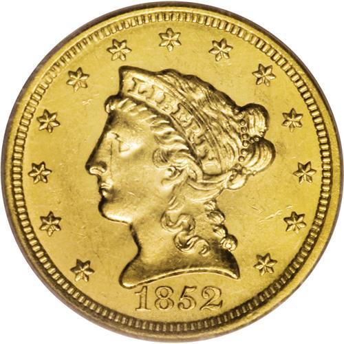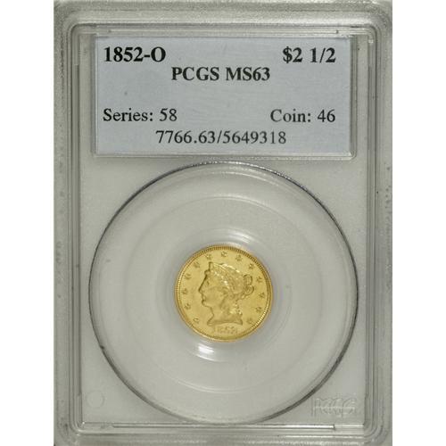 <B>1852-O $2 1/2 MS63 PCGS.</B></I> During the early 1850s, the influx of newly mined California gold ensured higher gold production at all of the different mints, including 140,000 quarter eagles that were struck at New Orleans in 1852. Despite this mintage, the surviving population seems to be quite low, and Mint State examples are rare at all grade levels. This piece is the only MS63 graded by PCGS, and just four similar grade coins have been certified by NGC (4/07). Neither service has seen a finer quality piece. This example is an impressive green-gold piece with fully reflective fields and brilliant luster. A few minor hairlines are evident, but not are distracting. It has excellent eye appeal and ranks among the most highly desired pieces in this sale.<BR><BR><b>Shipping:</b> Coins & Currency (<a target="_blank" href="http://www.heritageauctions.com/common/shipping.php">view shipping information</a>)