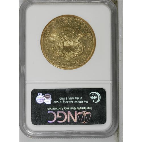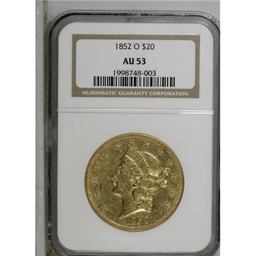 <B>1852-O $20 AU53 NGC.</B></I> The 1852-O is readily available in circulated grades, especially in the VF to XF grade range. Mid and upper-end AU pieces are more difficult to locate. This AU53 example displays bright yellow-gold surfaces with traces of luster in the protected areas. Light contact marks are evenly distributed over both sides, perhaps somewhat fewer in number and less severe than is typically the case for this normally heavily-abraded issue.<BR><BR><b>Shipping:</b> Coin/Currency (<a target="_blank" href="http://www.heritageauctions.com/common/shipping.php">view shipping information</a>)