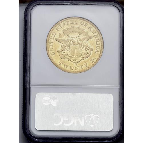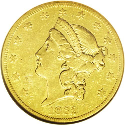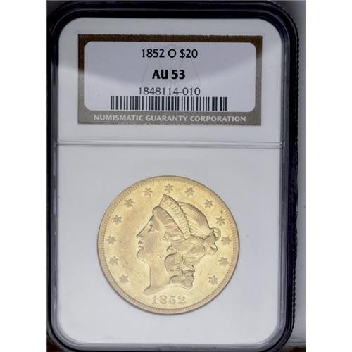 <B>1852-O<$20> AU53 NGC.</B></I> This briefly circulated double eagle displays considerable glowing luster when it is rotated beneath a light. The highpoints of the portrait display only moderate wear, and the few noticeable obverse marks are fully appropriate for the grade. All New Orleans twenties are scarce, and since a majority of the O-mint dates are rare, type demand focuses on the few collectible issues.