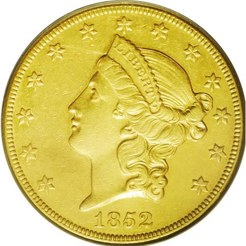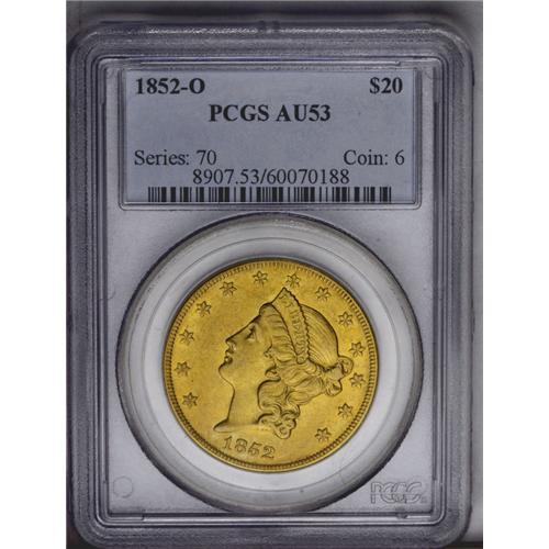 <B>1852-O<$20> AU53 PCGS.</B></I> A beautiful example of this historic, early O-mint product, this piece offers much luster remaining over somewhat prooflike fields, with yellow-gold surfaces that display only light circulation wear. Light field chatter and a couple of small scrapes on Liberty's cheek are present, but the overall quantity and severity of contact marks are much less than might be expected. A nice one. Population: 40 in 53, 69 finer (6/06).<BR><I>From The Frank Schwerin Collection.</B></I>