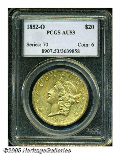 1852-O $20 AU53 PCGS. This is a subtly colored, g