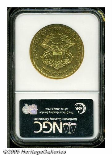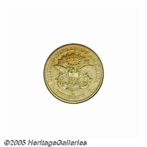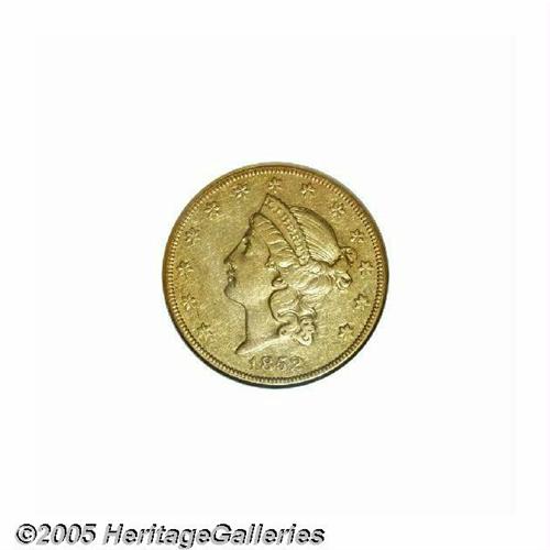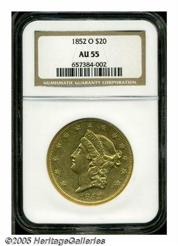 <B>1852-O<$20> AU55 NGC.</B></I> Despite a modest original mintage of 190,000 pieces, the 1852-O is the most common O-mint Double Eagle of the 1850-1852 era. This is a satin finished example whose lightly rubbed surfaces reveal flashes of original luster at most angles. The devices are sharply impressed, the number of abrasions is consistent with the assigned grade. A yellow-gold representative.