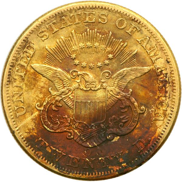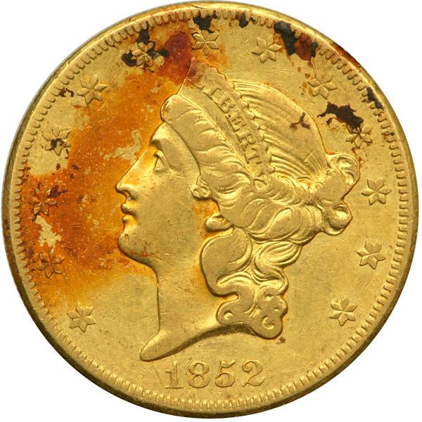 1852-O $20 Liberty. Sharpness of AU-50. However some stains on both sides. Perhaps from a ship wreck. Mintage: 190,000.
