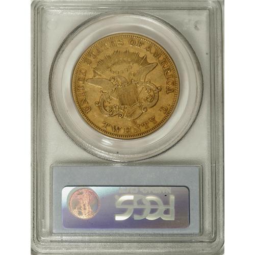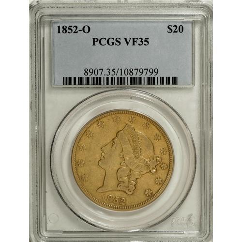 <B>1852-O $20 VF35 PCGS.</B></I> Luster shimmers from the reverse peripheral legends, as well as the eagle's shield and rays. This low mintage New Orleans twenty has a few minor field marks, but is less abraded than is common for the grade and denomination.<BR><BR><b>Shipping:</b> Coins & Currency (<a target="_blank" href="http://www.heritageauctions.com/common/shipping.php">view shipping information</a>)