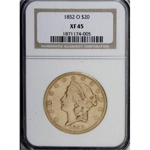 <B>1852-O $20 XF45 NGC.</B></I> With a mintage of 190,000 coins, the 1852-O is one of the more available double eagles produced by the New Orleans Mint. The example in this lot is characteristic of most early O-mint twenties, having an average strike and moderately abraded surfaces. Mint-made beveled rims, common to this issue, are also observed. The coloration is an attractive light yellow-gold. <BR><BR><b>Shipping:</b> Coins & Currency (<a target="_blank" href="http://www.heritageauctions.com/common/shipping.php">view shipping information</a>)