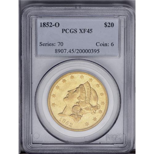 <B>1852-O<$20> XF45 PCGS.</B></I> This Choice XF piece shows even wear over the highpoints and light reddish patina, while the recessed areas are more orange-gold. Notably clean for the grade. One of the more common and affordable New Orleans Type One twenties.