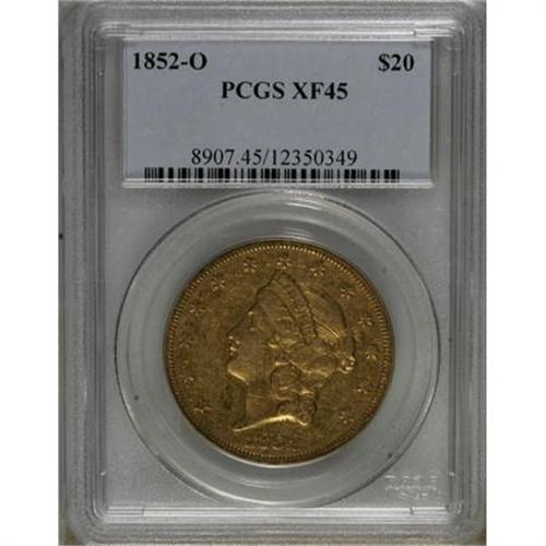 <B>1852-O $20 XF45 PCGS.</B></I> A touch softly struck on the portrait, though the overall definition on this lightly circulated O-mint twenty is slightly above-average. The luminous orange-gold surfaces show extensive abrasions, yet it retains a surprising degree of eye appeal.<BR><BR><B>Coin Engraver:</B> James B. Longacre<BR><BR><b>Shipping:</b> Coins & Currency (<a target="_blank" href="http://www.heritageauctions.com/common/shipping.php">view shipping information</a>)