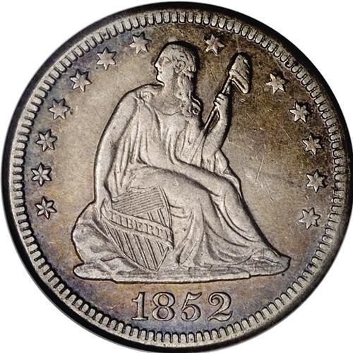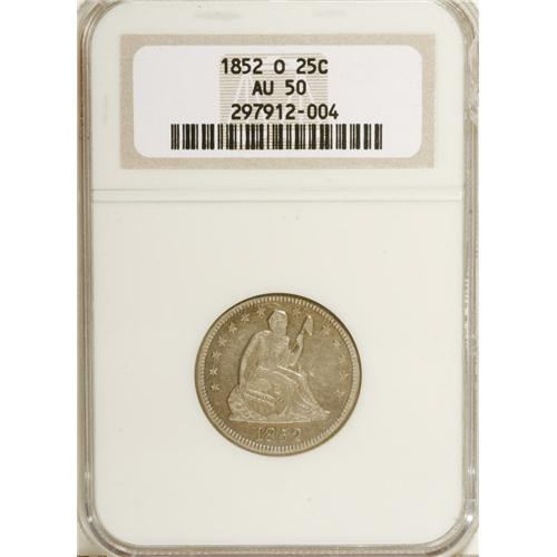 <B>1852-O 25C AU50 NGC.</B></I> Seated quarter dollar specialists will want to seize the opportunity to acquire this coin, as AU examples of this date seldom appear in the marketplace. This is a lovely light gray piece with faint gold and iridescent toning. A few faint ticks and hairlines are not distracting to any degree.<BR><BR><b>Shipping:</b> Coin/Currency (<a target="_blank" href="http://www.heritageauctions.com/common/shipping.php">view shipping information</a>)
