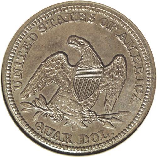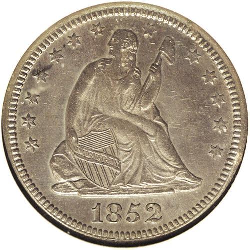 <B>1852-O<25C> MS62 ANACS.</B></I> The 1852-O is a fabulously rare coin in Mint State. Larry Briggs' <I>The Comprehensive Encyclopedia of United States Seated Liberty Quarters</B></I> lists this issue as a High R.7 in Uncirculated. NGC and PCGS have graded a total of <I>three</B></I> specimens of the issue in Mint State, namely an MS63 at PCGS and one each in MS61 and MS62 at NGC (4/06). This issue is interesting not only from a rarity perspective, but also from a historical point of view: it is the only Seated Liberty quarter that was struck with a rounded or beveled rim that failed to protect the interior of the coin from early (and often advanced) wear.<BR> The present specimen offers deep, even plum-gray toning over both sides, with a decent strike for this issue that Briggs' tome says is always poorly struck. The localized strike weakness is confined largely to the right-side stars and Liberty's head and neck on the obverse, and to the eagle's claws and fletchings on the reverse. The Seated Liberty quarter specialists need to act decisively here: this is only the second time that we have offered a problem-free Mint State specimen of this issue.